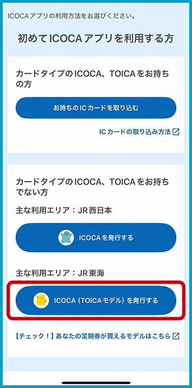 「ICOCA(TOICA)モデルを発行する」を選択